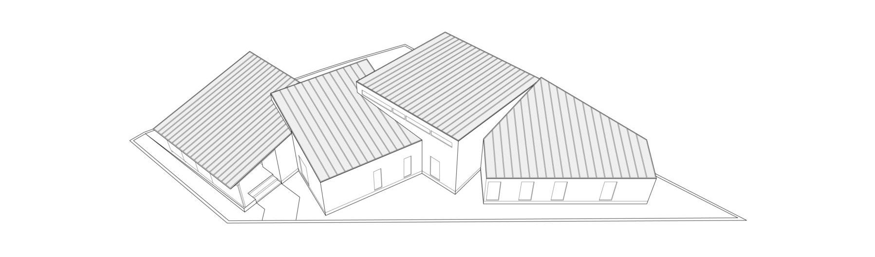石川県内灘町に計画された歯科医院である。日本海から吹き抜ける風、曇天の多い北陸の空。この土地柄と歪な三角形の敷地に導かれるように、四つの小さな建築を雁行させた。角度や高さ、屋根勾配をわずかにずらすことで、風をおおらかに受け流し、リズミカルな景色を生み出している。