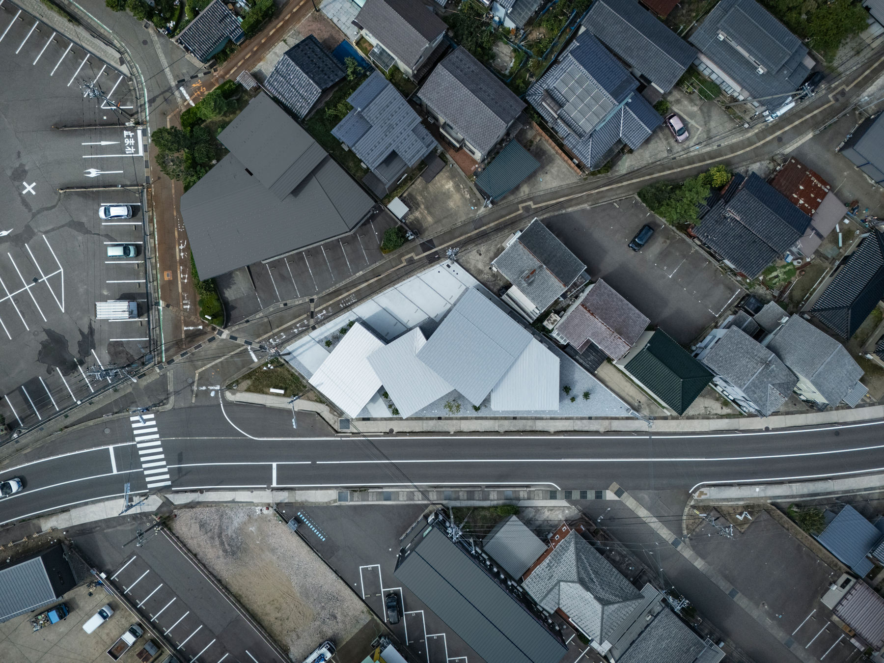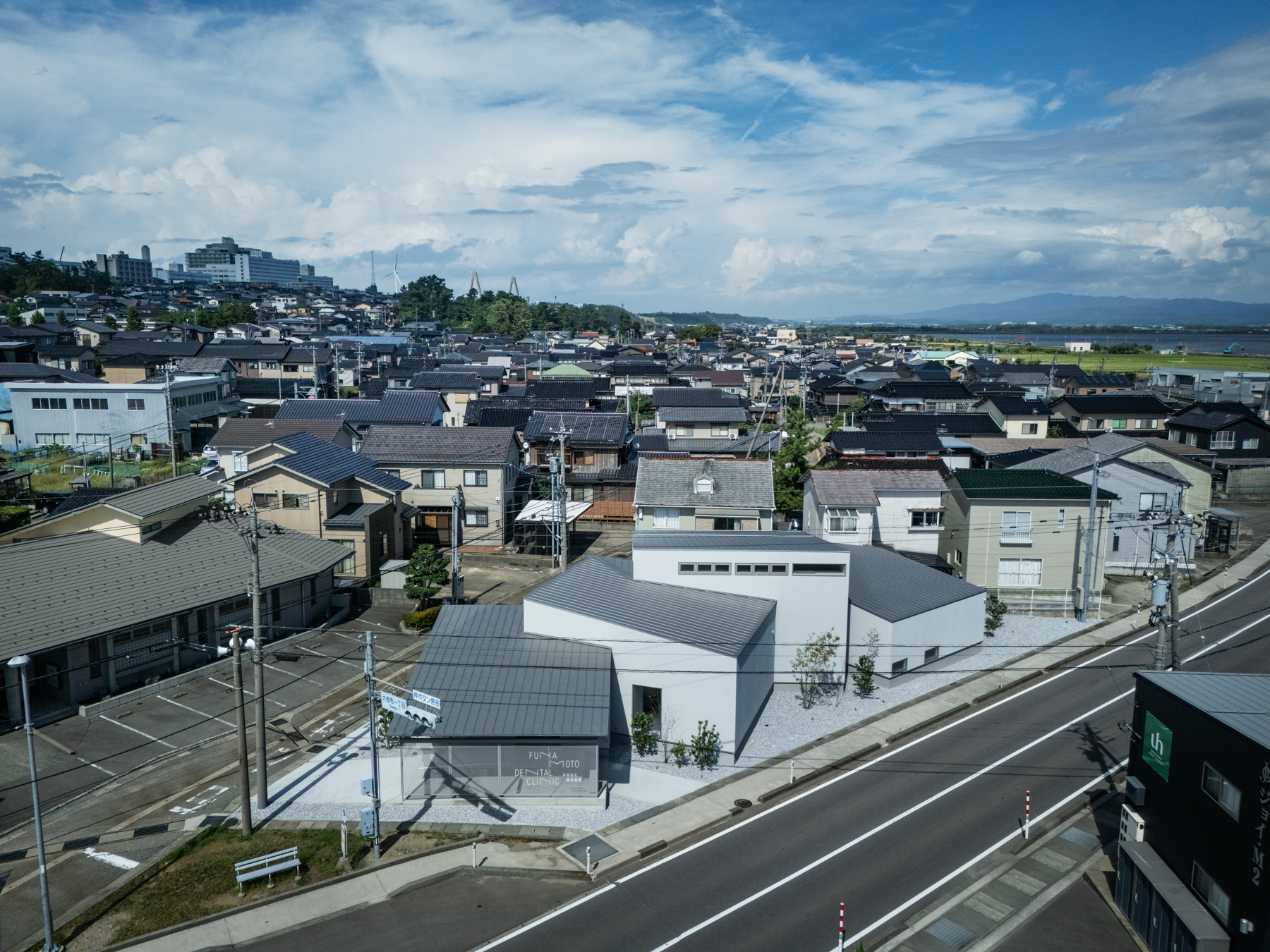This project is a dental clinic planned in Uchinada, Ishikawa. The strong winds sweeping in from the Sea of Japan and the overcast Hokuriku sky informed the design. Guided by these local conditions and the irregular triangular site, four modest volumes are arranged in a staggered formation. By subtly shifting their orientation, height, and roof pitch, the architecture gently diffuses the wind and forms a rhythmic presence in the landscape.