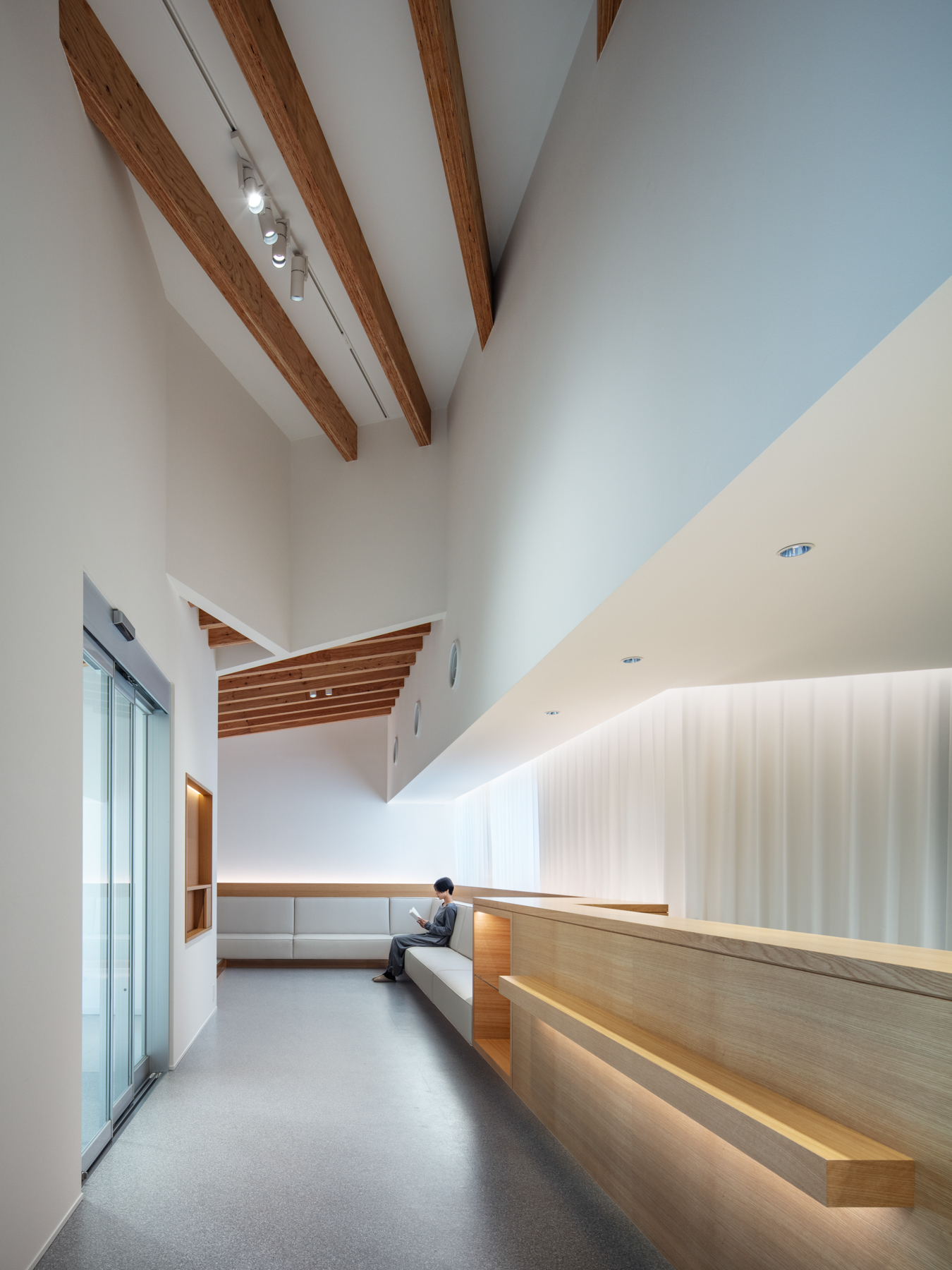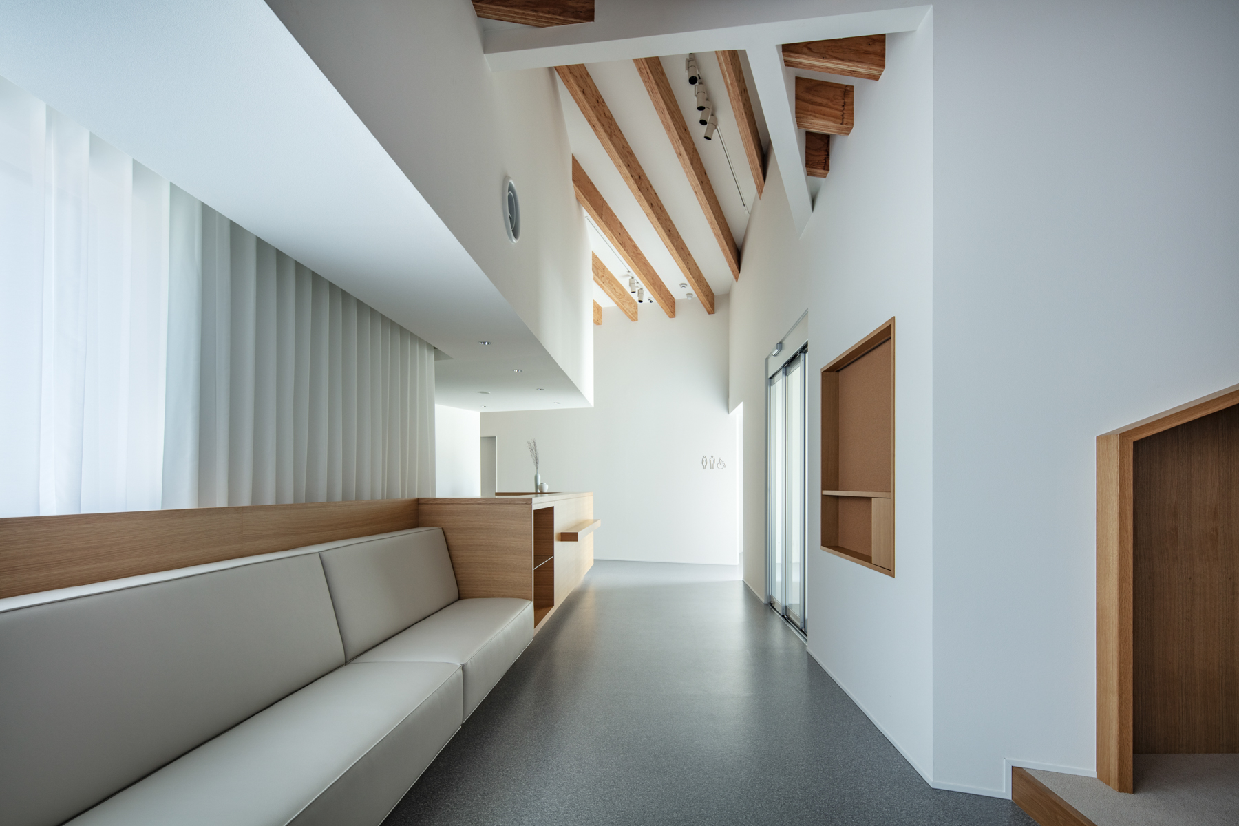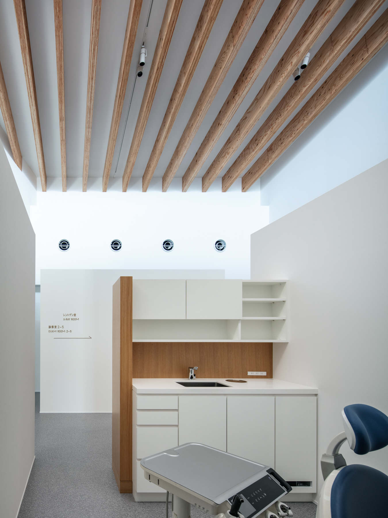 内部では、受付・待合・診療・スタッフエリアが機能的に分節しつつ、動線は一筆書きのように続く。働く人と訪れる人が交差せず、自然に奥へと導かれる。歩みを進めるごとに景色は少しずつ変化し、天井に連なる構造体の木ルーバーが光を受け止める。その光の重なりが清潔さと温もりを与え、伸びやかな高天井が治療の緊張を和らげる。
