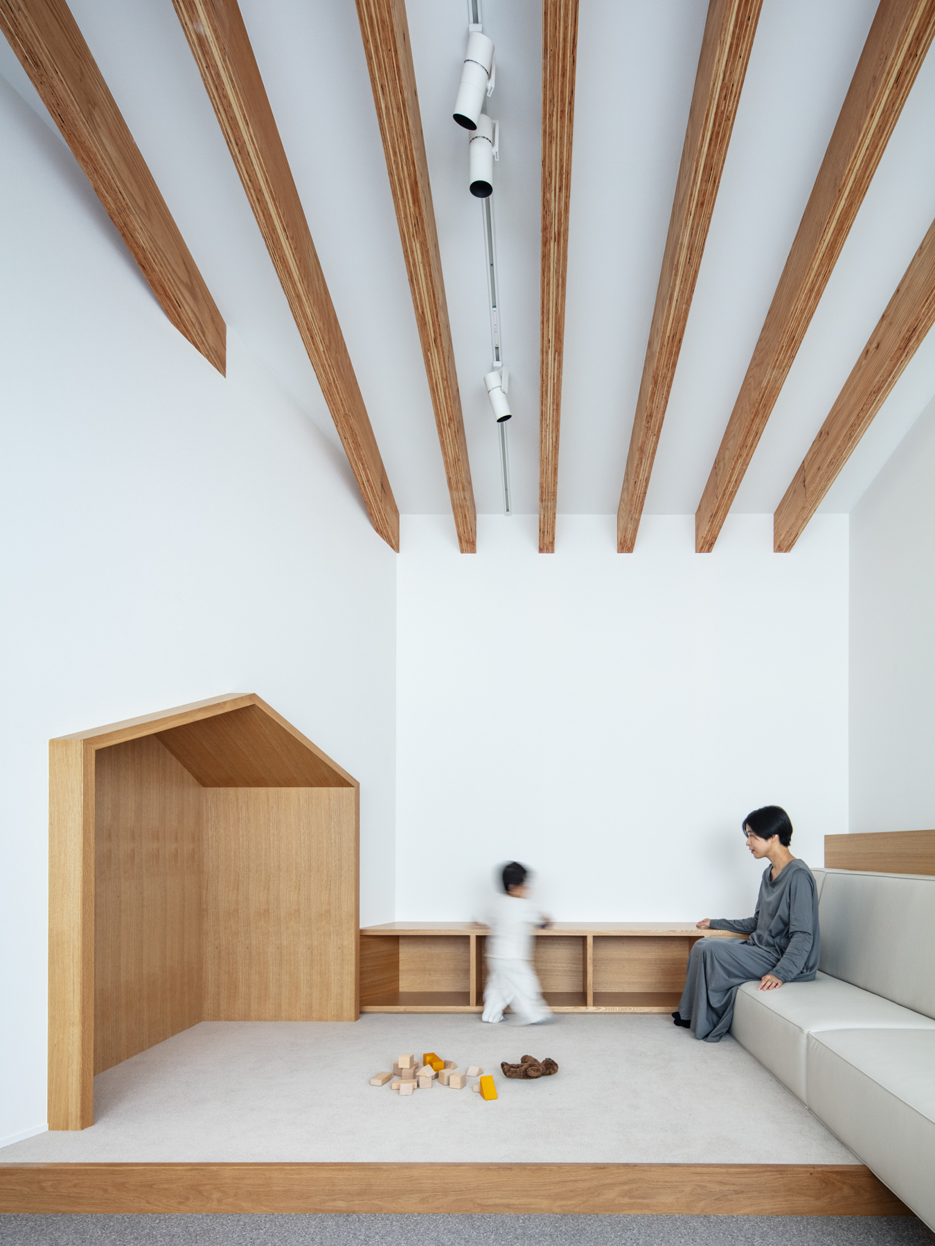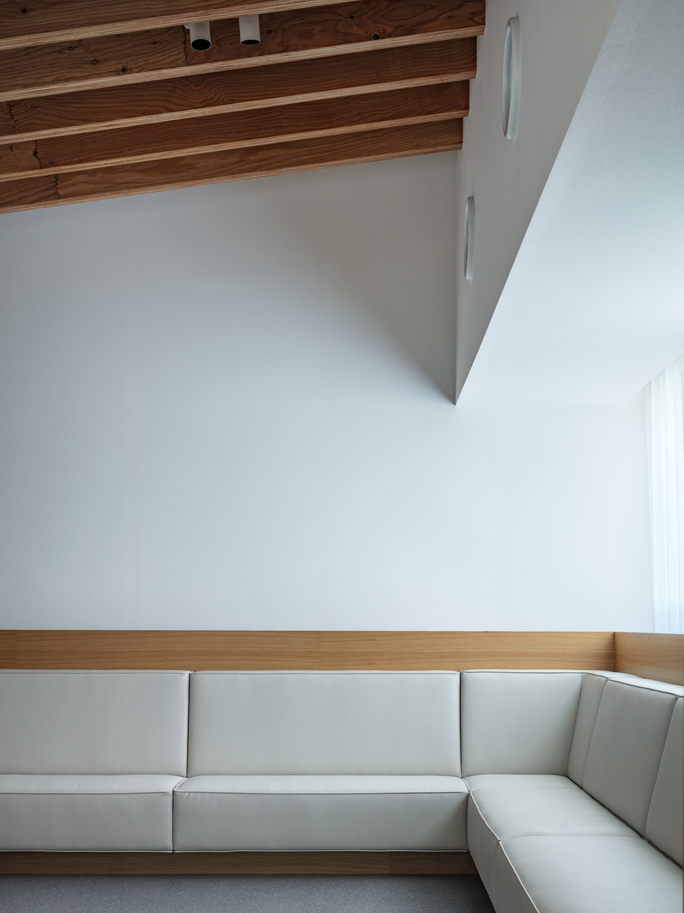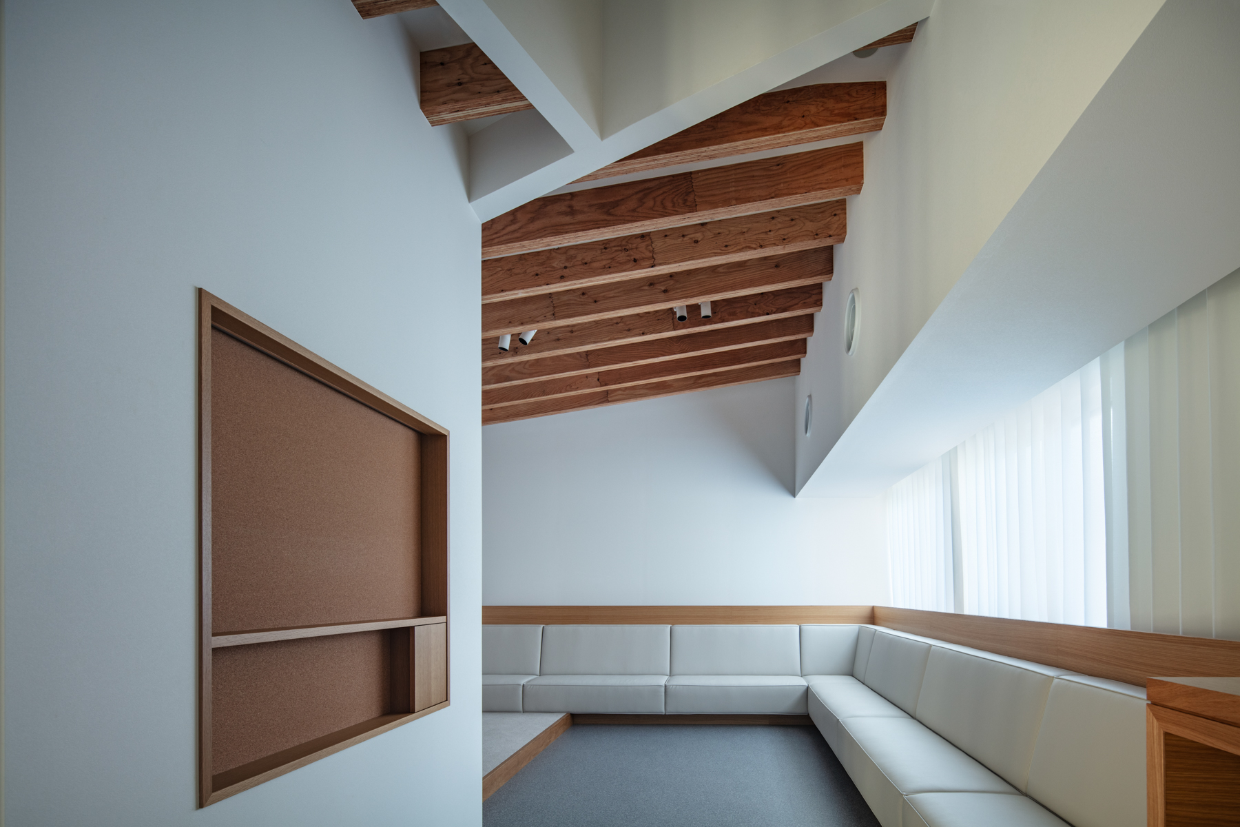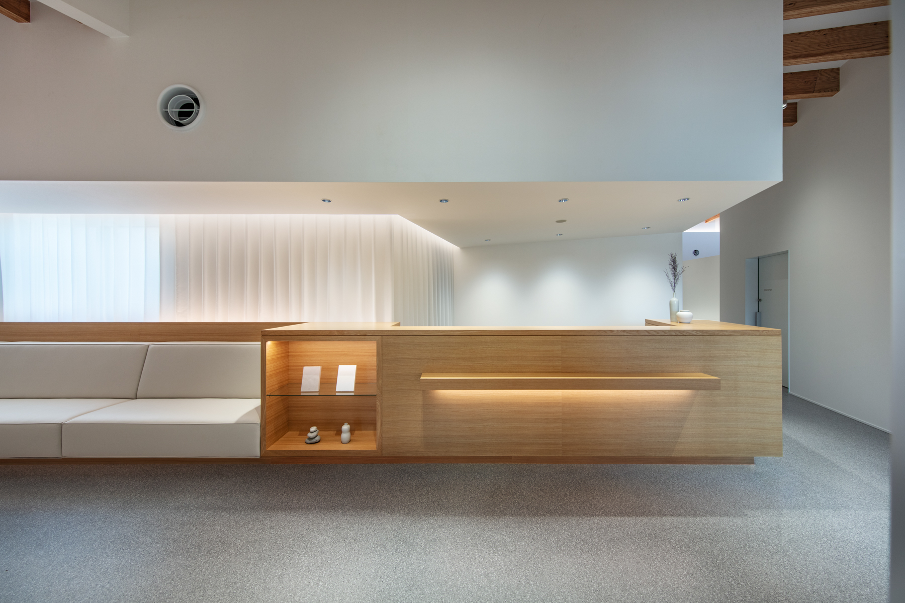 内部では、受付・待合・診療・スタッフエリアが機能的に分節しつつ、動線は一筆書きのように続く。働く人と訪れる人が交差せず、自然に奥へと導かれる。歩みを進めるごとに景色は少しずつ変化し、天井に連なる構造体の木ルーバーが光を受け止める。その光の重なりが清潔さと温もりを与え、伸びやかな高天井が治療の緊張を和らげる。