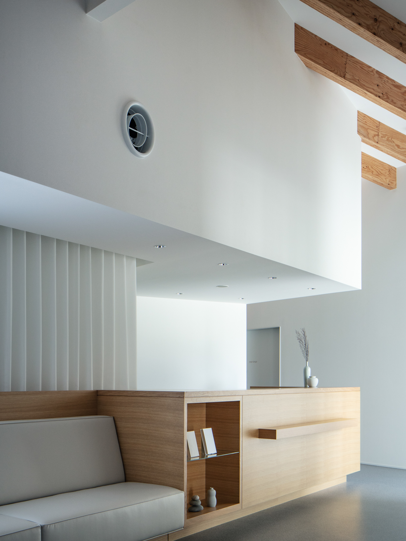 Inside, the reception, waiting, treatment, and staff areas are clearly articulated, while the circulation unfolds like a single continuous line. The spatial flow prevents visitors and staff from intersecting, naturally guiding movement toward the back. As one progresses through the building, the scenery changes gradually. Structural wooden louvers along the high ceiling capture and modulate daylight, adding clarity and warmth, while the generous ceiling height eases the tension inherent in clinical settings.
