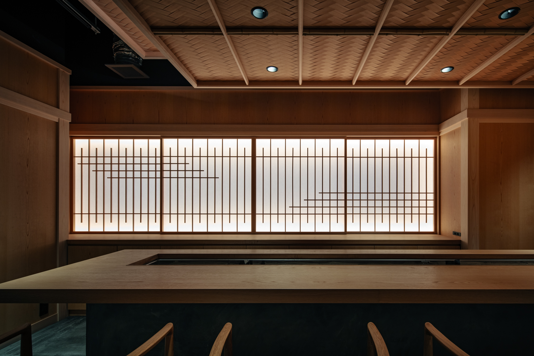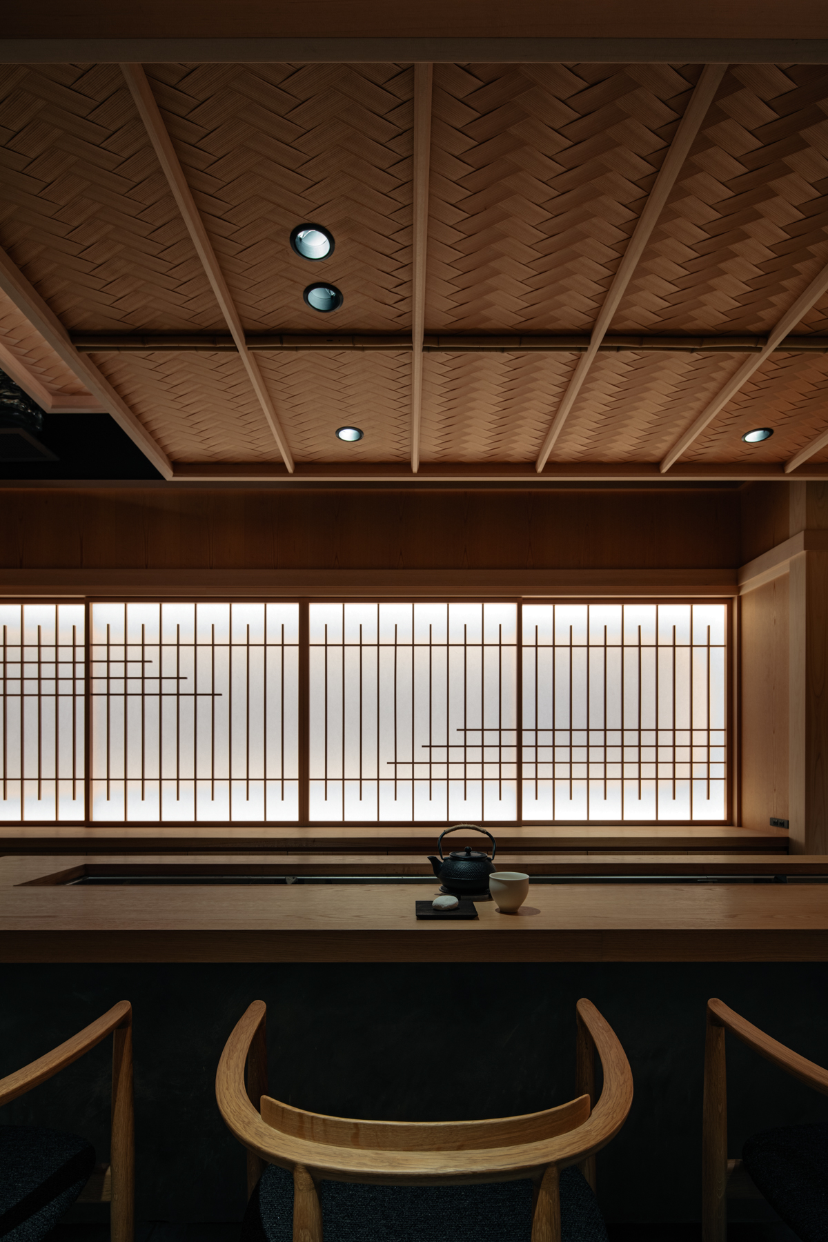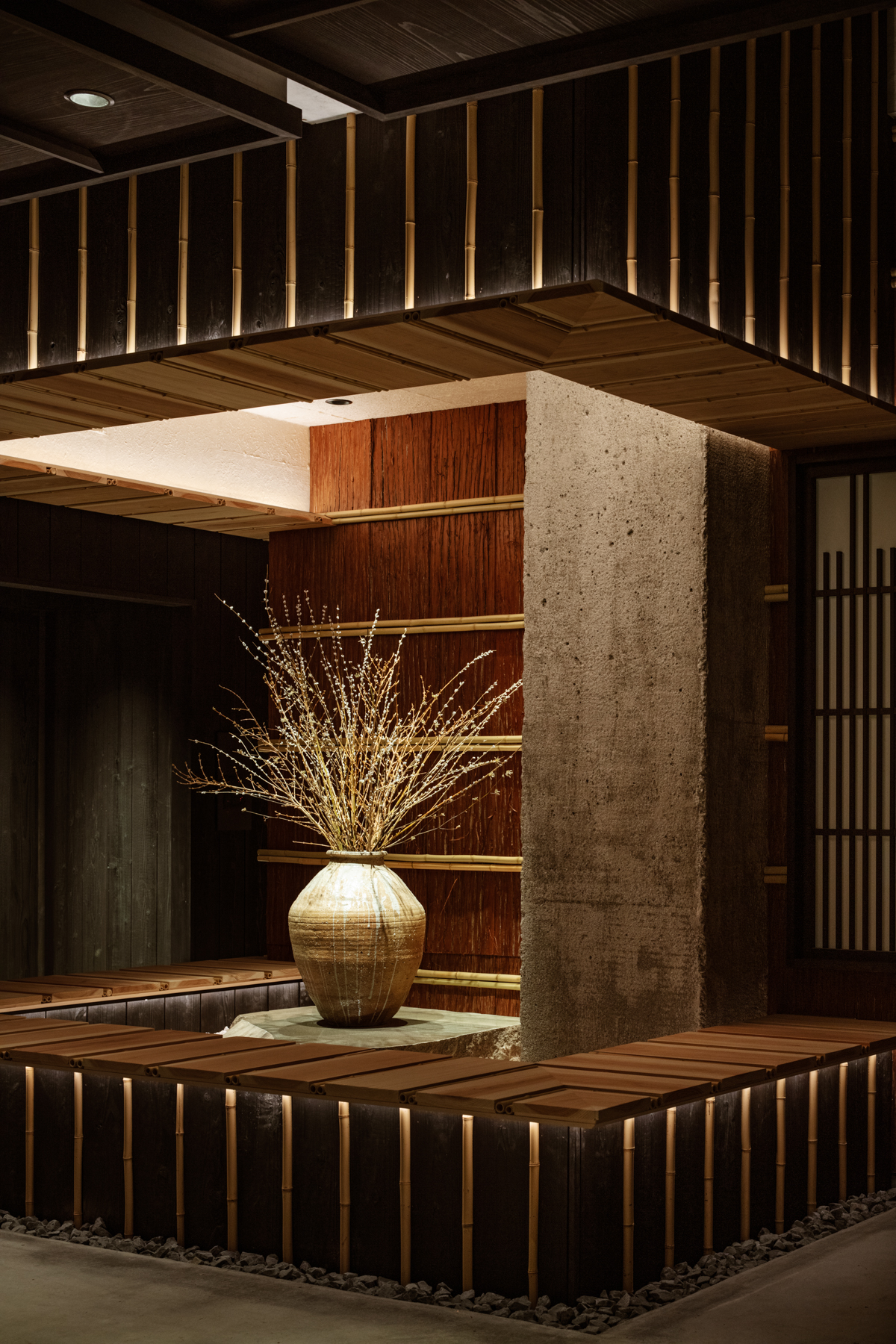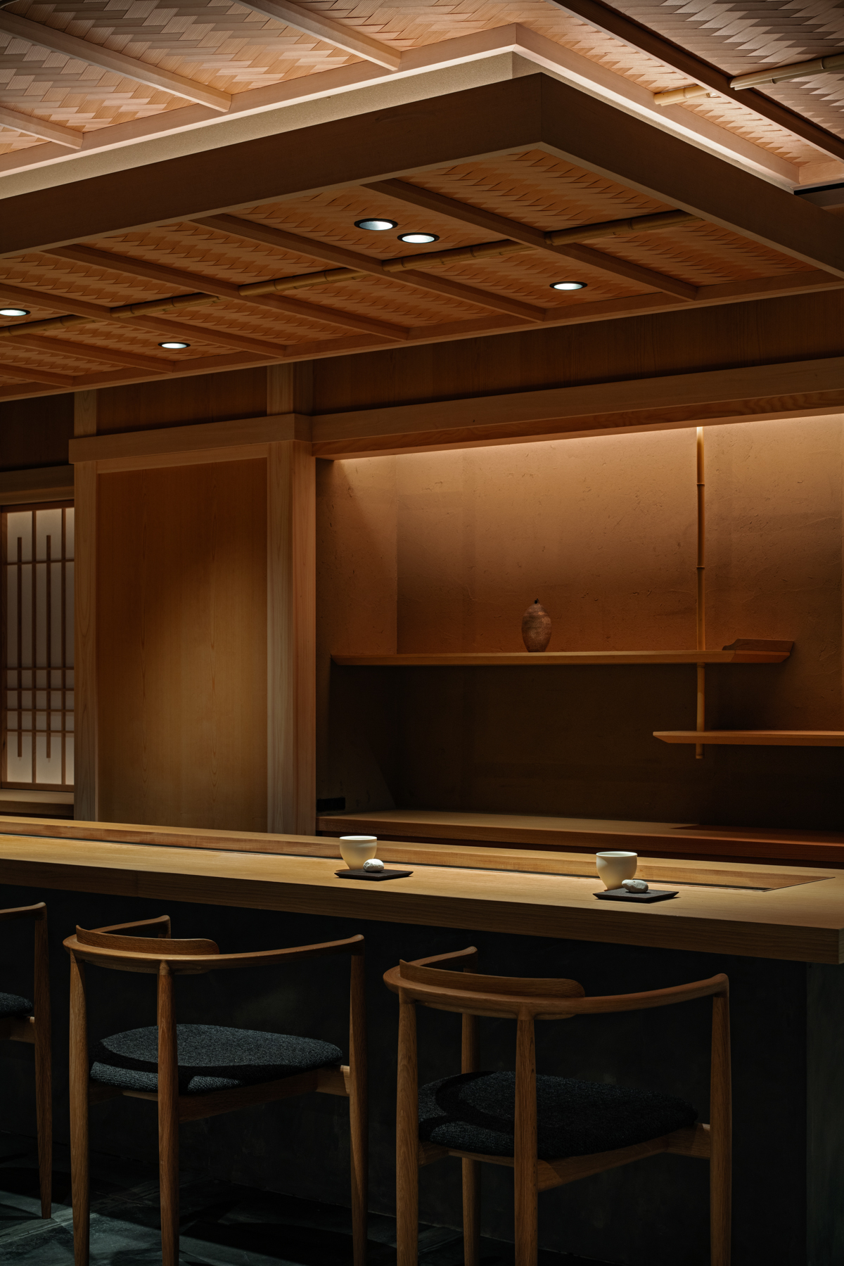 In terms of spatial detailing, we referenced traditional techniques passed down in Kyoto and throughout Japan, adapting them for use in a contemporary environment. Natural materials such as earthen plaster, charred cedar, cedar bark, cypress, bamboo, washi paper, and Komatsu stone were carefully selected and composed to bring out their innate organic textures.