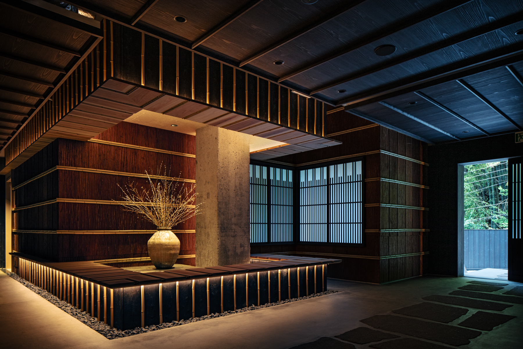 建物入口の暖簾をくぐると、焼杉の外壁や石畳、格子といった屋外の要素が屋内へと連続している。京都の町並みを彷彿とさせる路地空間の先には、町家の玄関のような客室入口があり、土間や坪庭を室内へと引き込むことで、明神ヶ岳の景色を背景とした開放的な構成としている。